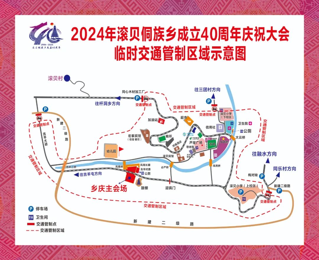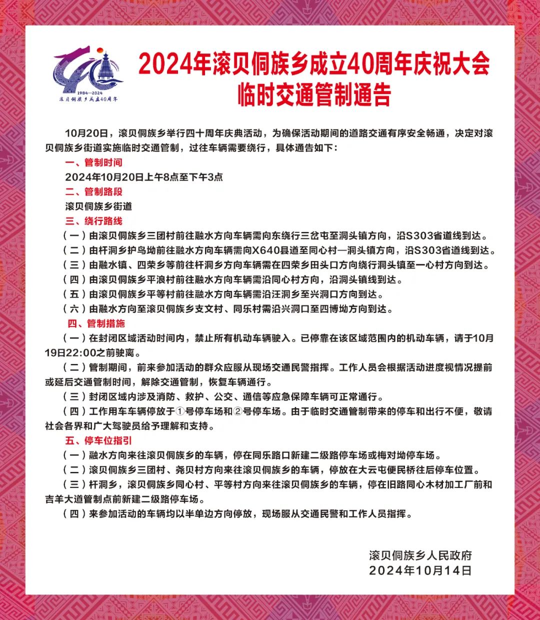 10月20日,滚贝侗族乡举行四十周年庆典活动,为确保活动期间的道路交通有序安全畅通,决定对滚贝侗族乡街道实施临时交通管制,过往车辆需要绕行,具体通告如下: