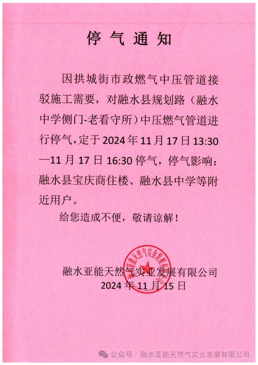 [城市公告] 融水拱城街中压燃气管道停气的通知