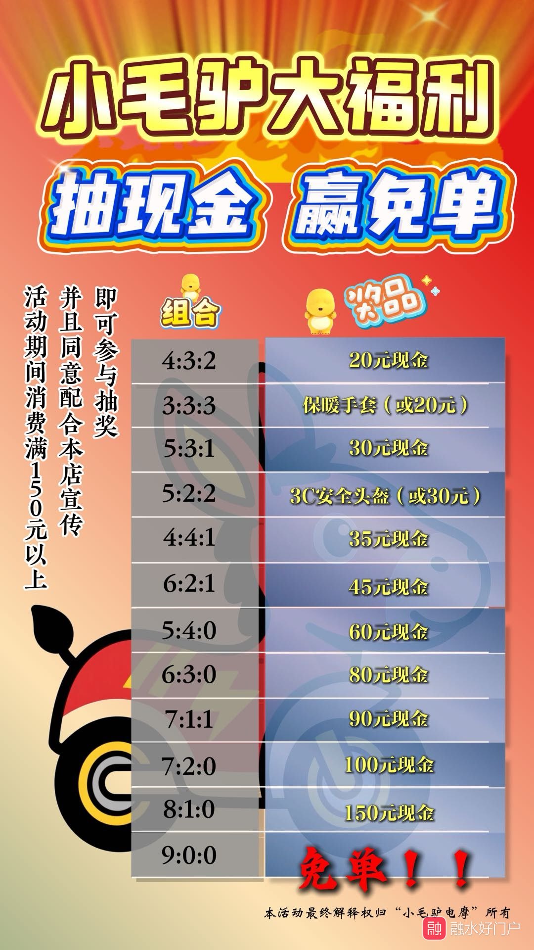 “小毛驴电摩”为回馈广大新老客户,现隆重推出“消费抽现金赢好礼”活动!惊喜多多,机会难得,欢迎到店参与!