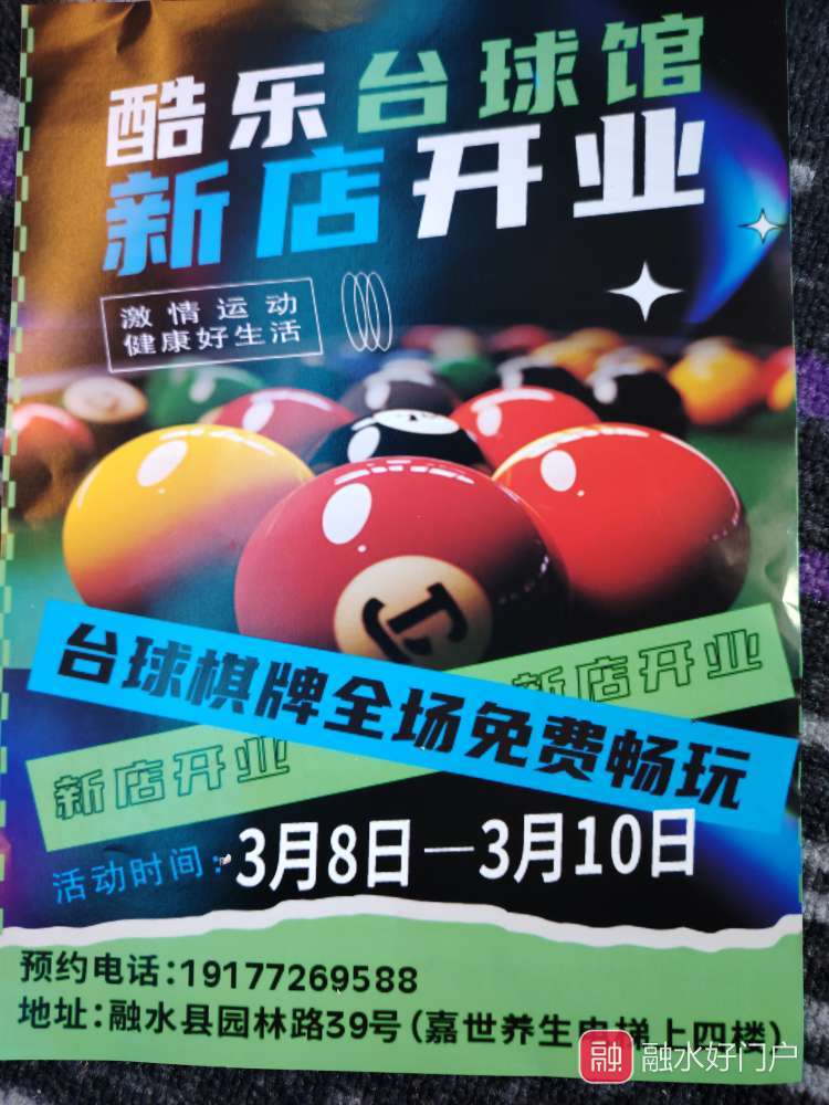 酷乐台球馆开业啦,3月8日至3月10日全场免费畅玩