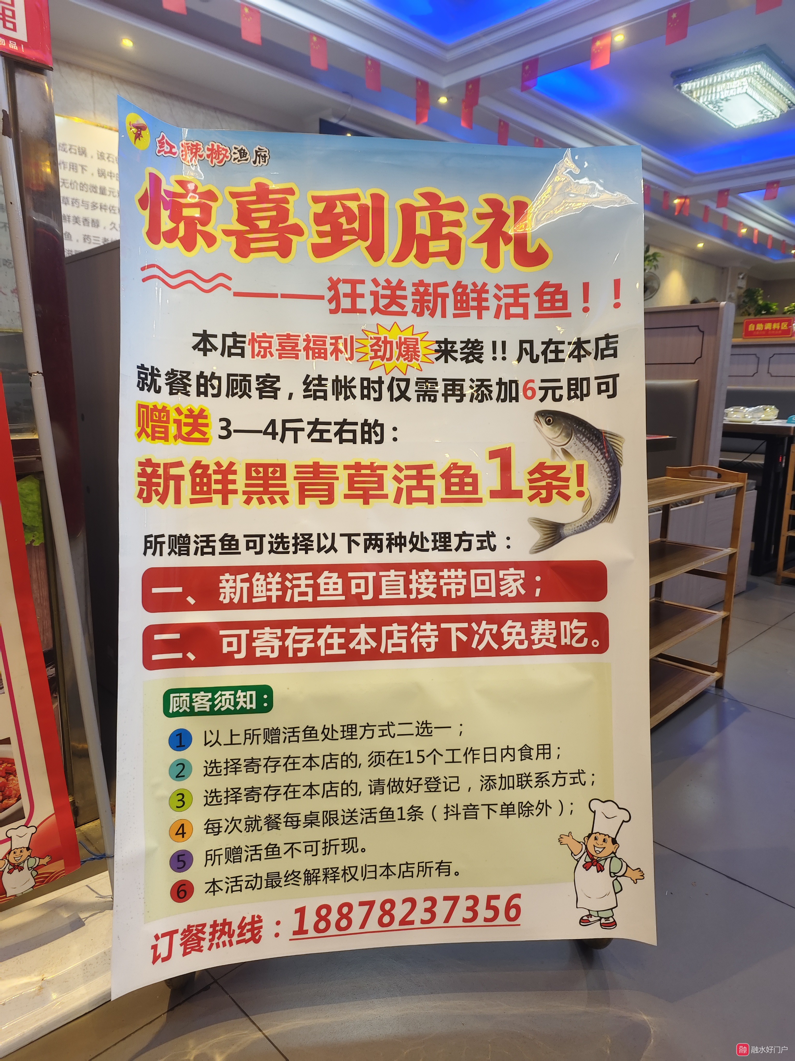 在店消费的顾客,结账时仅需再加6元即可送:3_4新鲜黑青草活鱼一条。