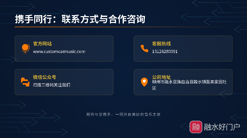 声临其境的专属定制,让每段旅程都有独特旋律。专业车载音乐服务,为出行打造无二听觉盛宴。完美匹配爱车,智能推荐超贴心,开启美妙驾驶时光。感兴趣的致电咨询:13128280091