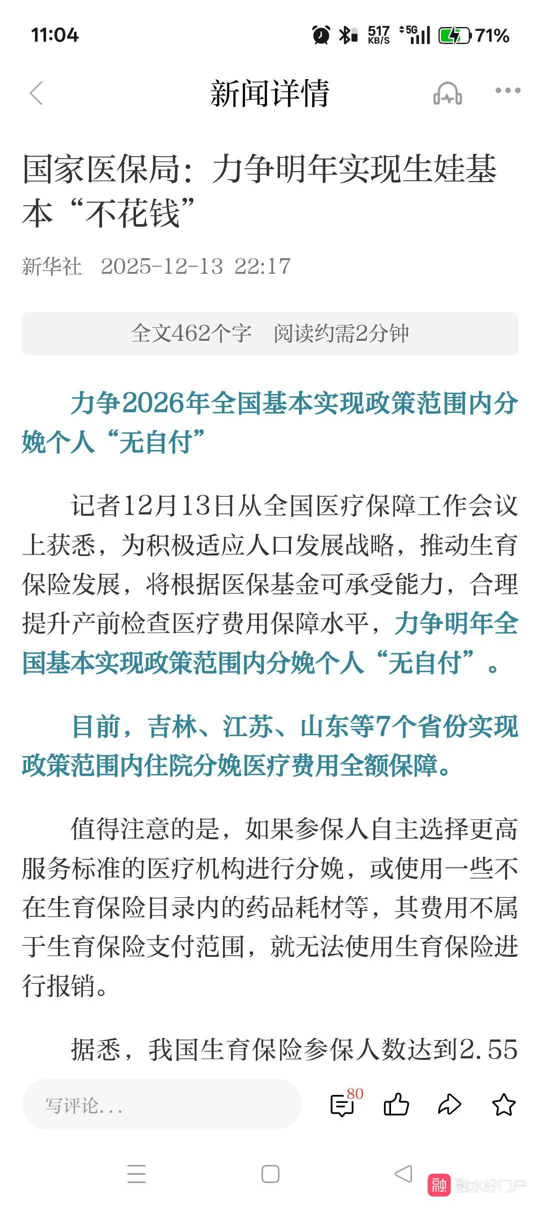 看到新闻说,明年开始生娃住院基本自己不用花钱了,顺产、剖腹产这些大头费用,医保都包了,连打无痛都可能报销。好像是国家这次下了决心要鼓励大家生孩子。如果生娃住院真不花钱了,你会愿意生吗?