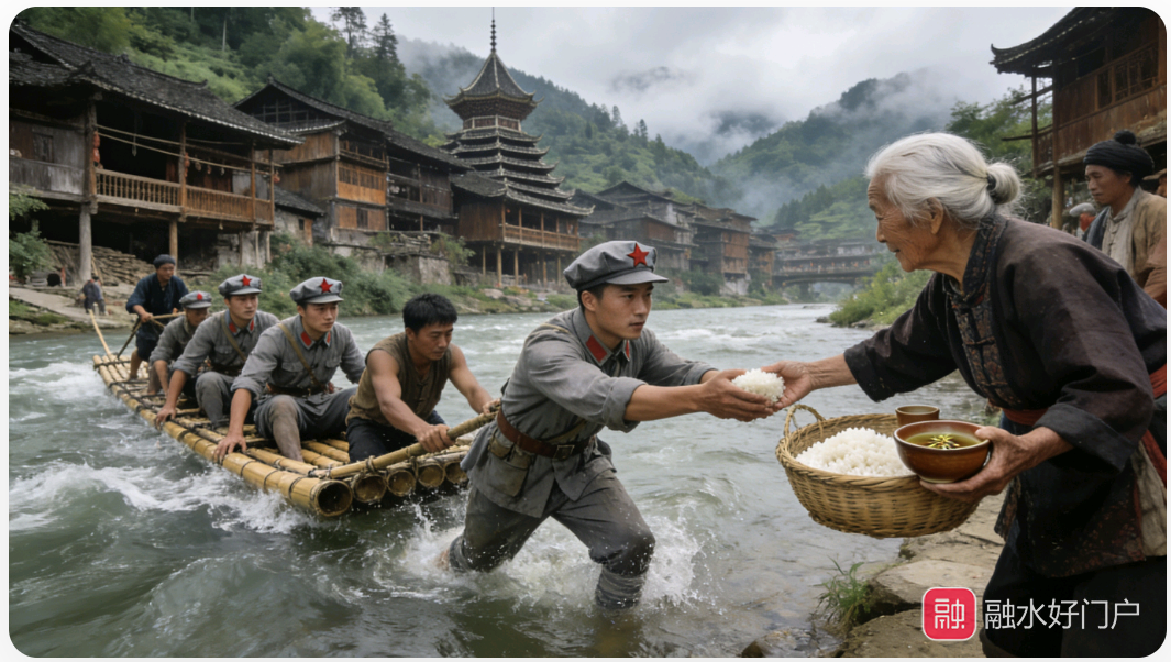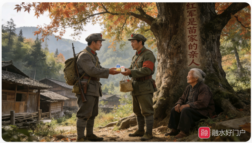 撤离途中的红七军,始终延续着在香粉乡形成的“军事行动与民族政策并重”的原则。途经安陲乡高文苗寨时,战士们即便疲惫不堪,仍严守群众纪律,不擅动村民一物。得知村寨里几位老人因担心兵祸躲进山林,军部特意派出会说苗语的战士进山寻访,用随身携带的盐巴和药品换取村民信任,临行前还在寨口的枫树上留下“红军是苗家的亲人”的标语,用朴素的行动打破了国民党反动派“红军烧杀抢掠”的造谣。在拱洞乡的侗族村落,村民们受香粉乡军民同心故事的感召,自发组织青壮年为红军带路,用竹筏帮助部队渡过湍急的贝江支流,不少老人连夜蒸煮糯米饭、炒制油茶送到红军手中,用苗山儿女最真挚的方式支援北上征程。