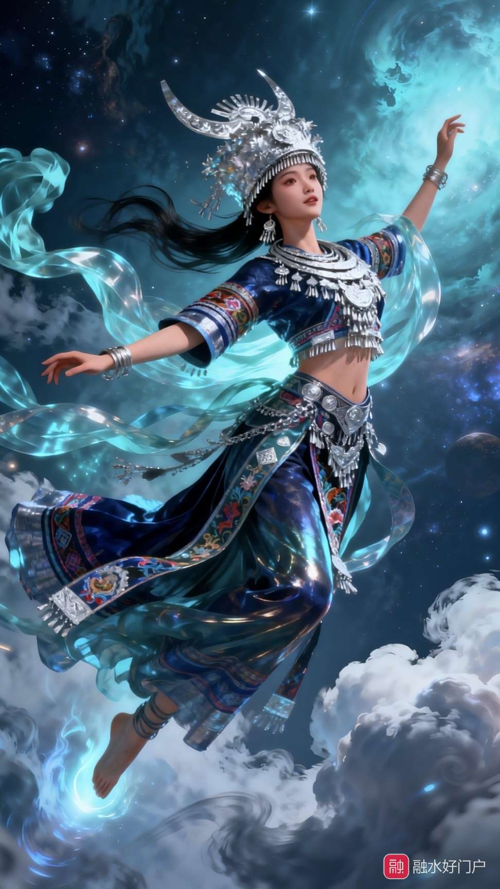 第二天醒来,多帕飞呜发现那套银饰在晨光中闪耀着不同寻常的光泽。她鬼使神差地穿戴起来——牛角头饰、多层项链、手镯、脚环,还有那件深蓝色短衣和黑色短裙,上面的刺绣仿佛活了过来,花瓣在微微颤动。 当最后一枚银饰佩戴妥当,多帕飞呜的双脚突然离开了地面。她惊慌地发现自己在上升,穿过屋顶,向着天空飞去。寨子越来越远,她穿过云层,来到一片星海之中。 在这里,她见到了梦中的飞天仙女,此刻正站在云海之上,丝带在她周围飘舞。 “我是苗寨守护者,”女子开口,声音如银铃,“每一百年,我们需要找到新的传承者。你拥有纯净的心灵和匠人的巧手,是飞天仙子的新化身。” “我需要做什么?”多帕飞呜既恐惧又兴奋。 “守护人们的梦境,”女子展开双臂,星空随之旋转,“在梦中给予希望,驱逐噩梦,为迷失者指引方向。但切记,你只能在月圆之夜化身蝶舞,且不可为私心使用这份力量。” 女子开始起舞,动作与多帕飞呜在梦中见到的一模一样,却又更加玄妙。多帕飞呜不知不觉跟着舞动,那些动作仿佛早已烙印在她的身体记忆中。她舒展双臂,抬起一只脚,银饰随着动作发出悦耳的声响,丝带在她周围画出淡蓝色的光弧。 “银月蝶之舞,是连接天地、沟通梦境的桥梁。”女子的声音逐渐飘远,“记住,你的力量来自人们对美的向往和对梦的信仰...” 女子的身影化作星光散去,多帕飞呜发现自己站在自家的院子里,仿佛从未离开。但当她抬头,看到夜空中有一道淡蓝色的轨迹划过,像是丝带在星空留下的印记。