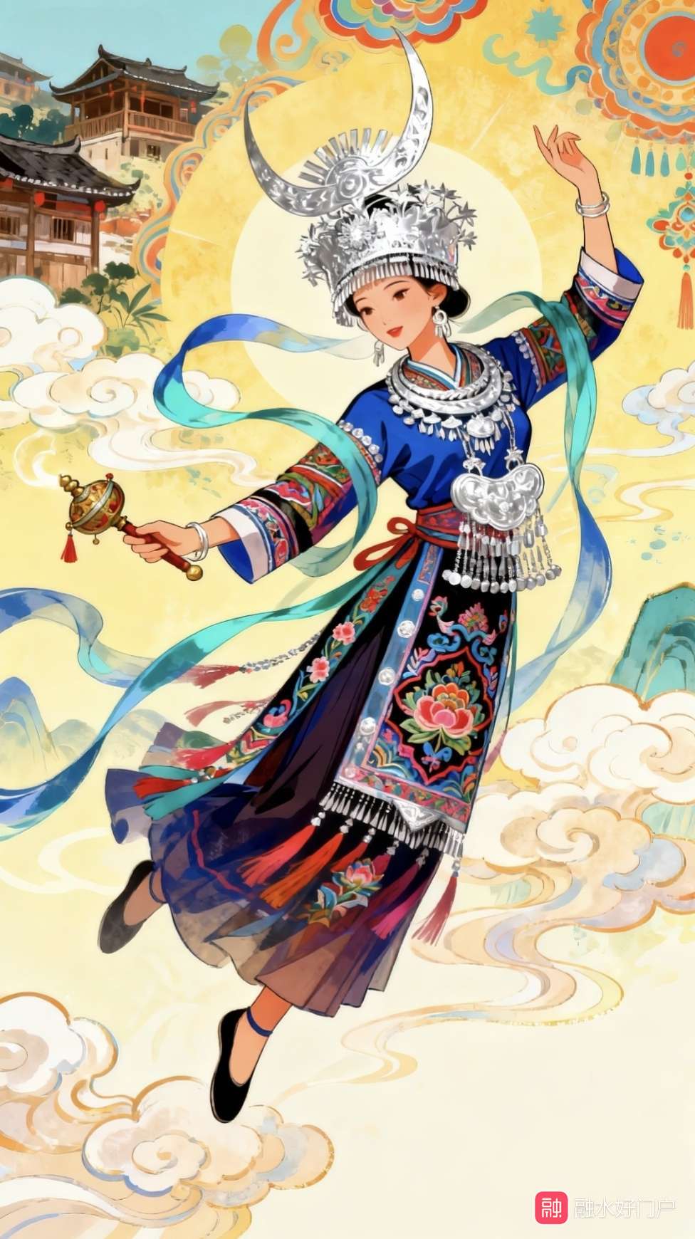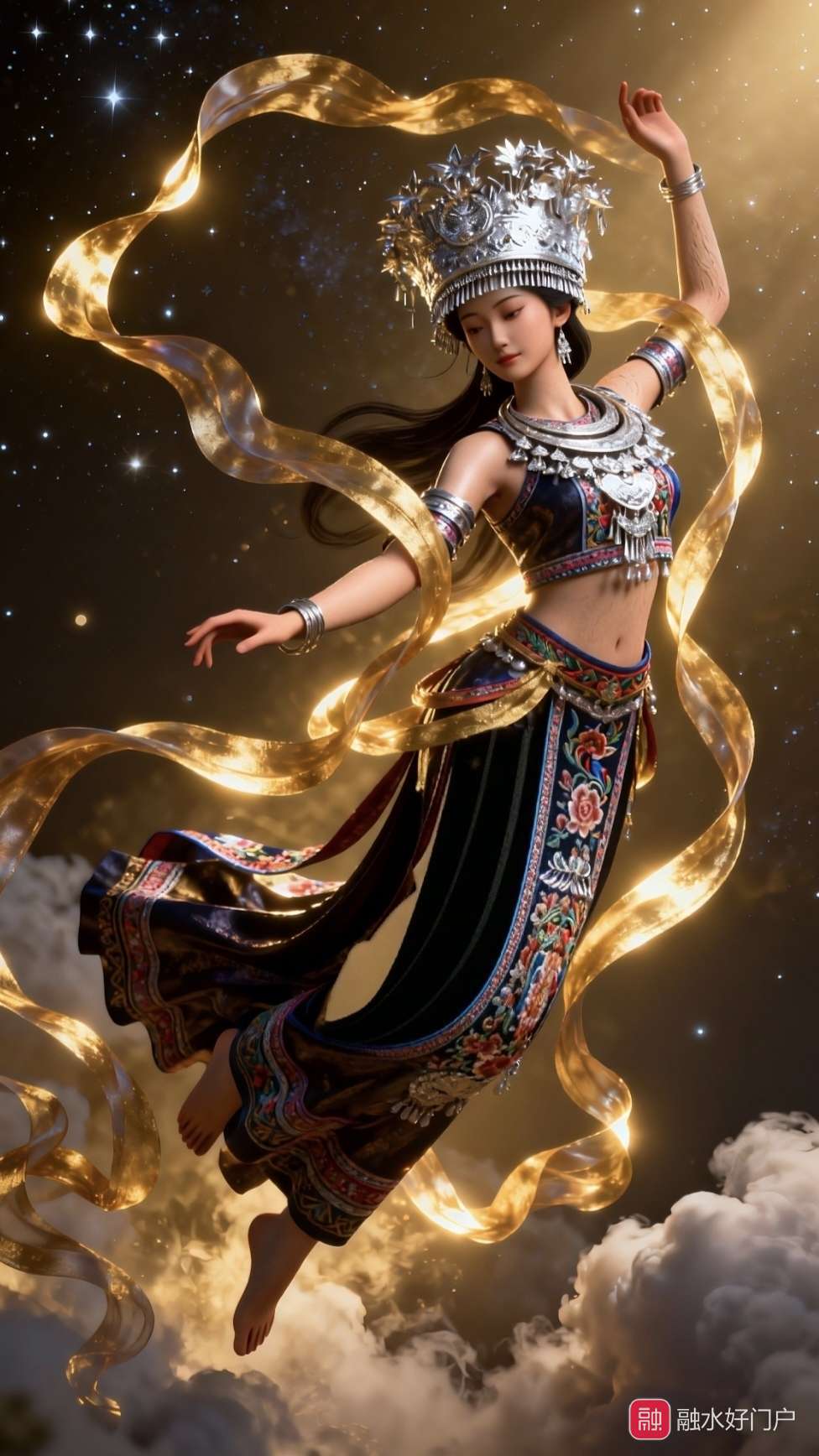 多帕飞呜是苗寨最年轻心灵手巧的银匠,她喜欢戴着银质牛角头饰,有一天晚上梦见一女子在星空中起舞,四周云雾缭绕,银饰碰撞的清脆声响如天籁。每当月圆之夜她就会梦见那女子向她伸手,仿佛在呼唤。 寨里的老祭司告诉她:“你梦到的是天上飞天仙女。当飞天仙女在梦中出现,便是传承之时。” 那一夜,多帕飞呜又一次梦见那飞天仙女。从星空中缓缓降落,站在了多帕飞呜面前。女子的银饰在月光下闪耀,层层叠叠的项链、手镯、脚环,每一件都精致无比,却又让多帕飞呜感到莫名熟悉。 “这些都是我打造的。”多帕飞呜突然意识到,“这些花纹...这是我祖母教我的古老纹样。” 飞天仙女微笑着点头,她的身影开始变得透明,化作无数银光闪烁的蝴蝶。蝴蝶们汇聚成一道光流,注入多帕飞呜床头那套她花了一年时间打造、却总觉得缺了什么的银饰中。