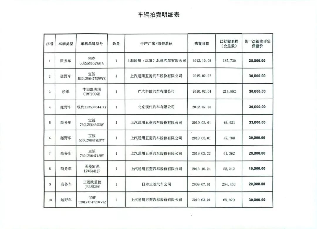 我公司定于2025年12月29日上午9时在融水县振城大厦(水东新区民族大道203号)19楼会议室对融水苗族自治县城市建设投资有限公司所有的车辆2辆、融水县振城房地产开发有限公司所有的车辆2辆、广西融水安和汽车服务有限公司所有的车辆6辆,共10辆车分别进行第二次公开拍卖,本次拍卖的车辆包括本田凯美瑞、、别克GL8、北京现代、三菱、宝骏等(详见本公司拍卖清单)。