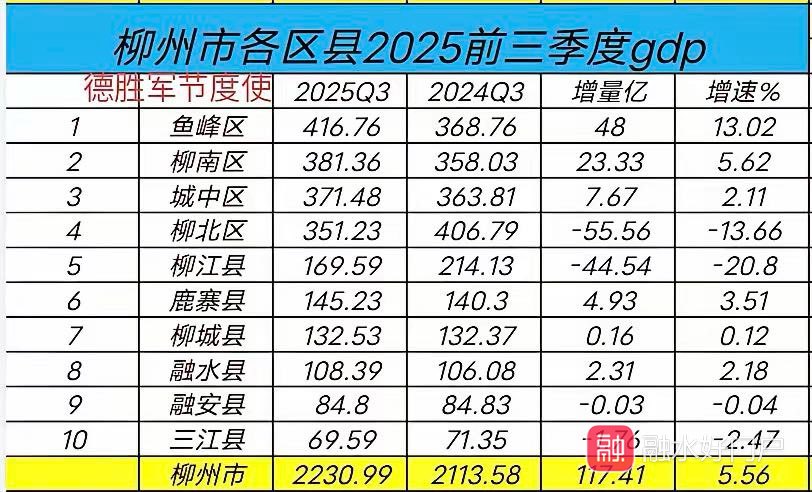 柳州市各区县2025年前三季度GDP,其中融水增长了……