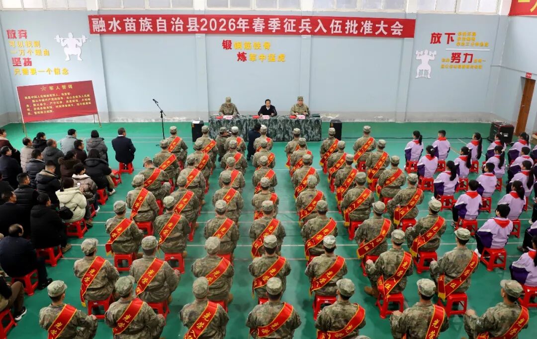 3月9日,融水苗族自治县召开2026年春季征兵入伍批准大会。县长韦贞强、县人武部领导刘艺参加大会,为即将奔赴军营的新兵壮行。