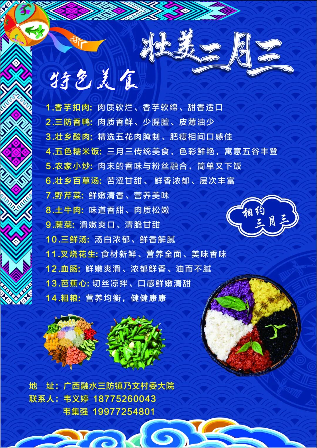 2.线下报名及参加方式:拨打咨询热线18775260043(韦女士)、19977254801(韦先生)—— 线上报名付费成功 —— 工作人员确认并告知桌名 ——凭入场券入场(入场券活动当天在主会场活动咨询台领取,地址:三防镇三月三民族团结广场 —— 体验“山歌+高山流水”等同年宴文化。
