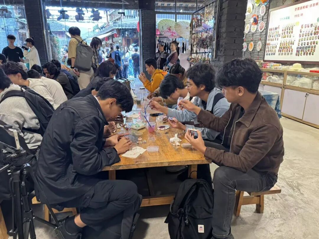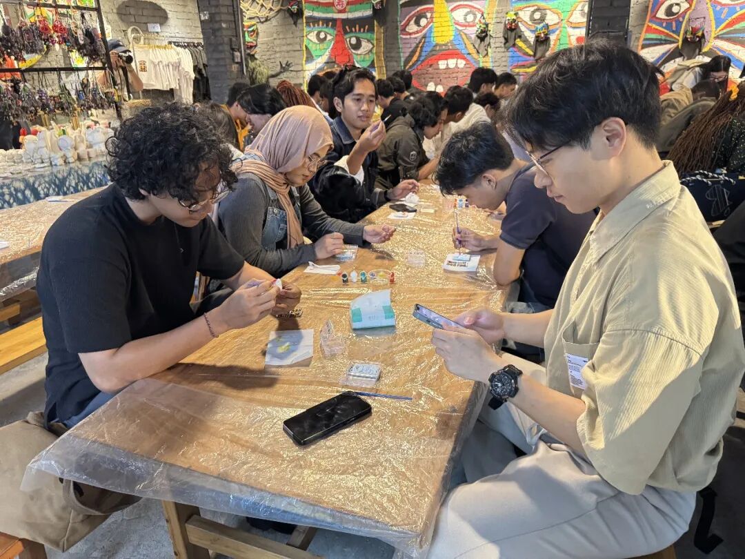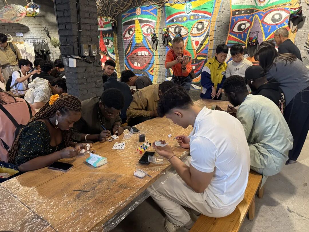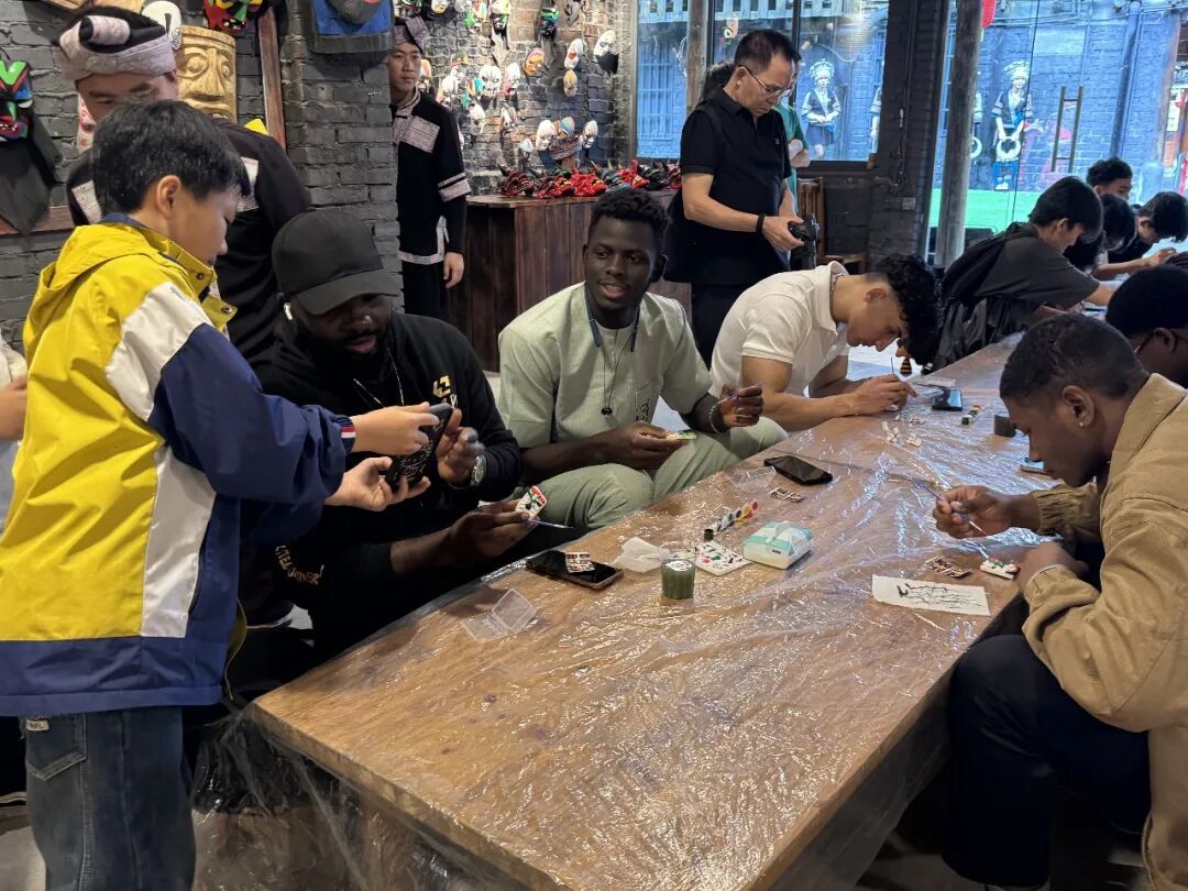活动中,留学生们首先参与了“芒篙涂画”手工体验。在苗寨艺人的指导下,大家亲手绘制独具民族特色的芒篙图案,感受民族传统艺术的独特魅力。随后,众人围坐一起,在轻松愉快的氛围中参与民俗互动小游戏,进一步拉近了与当地文化的距离。